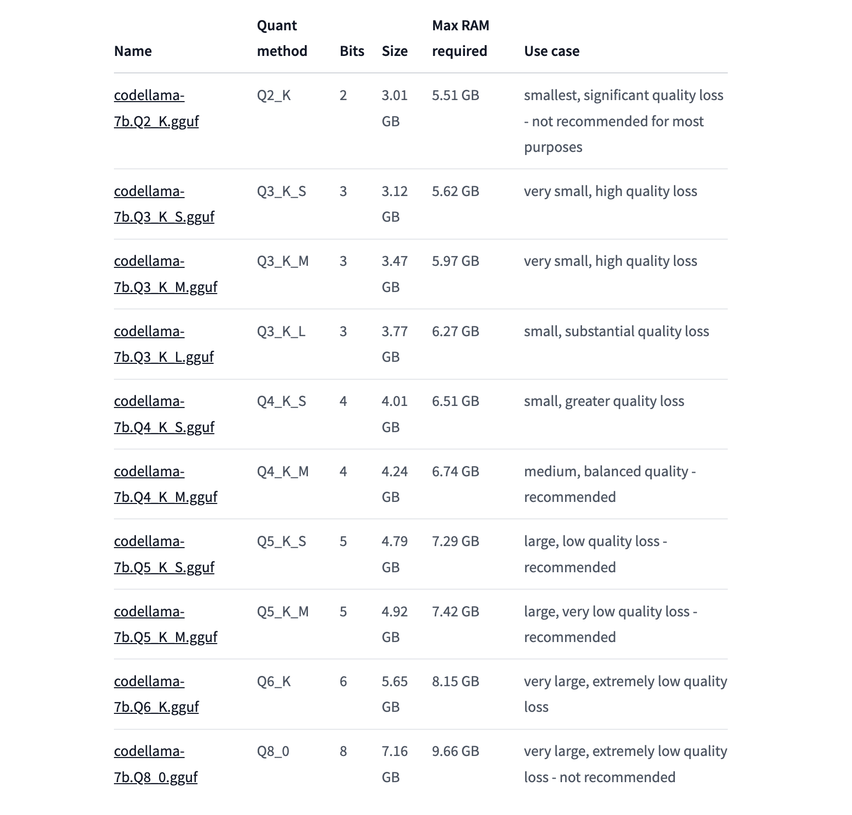 Tom has published models for each combination of model type and parameter count. For example, here’s the HF repo for CodeLlama-7B-GGUF. You’ll notice that each model type has multiple quantization options: