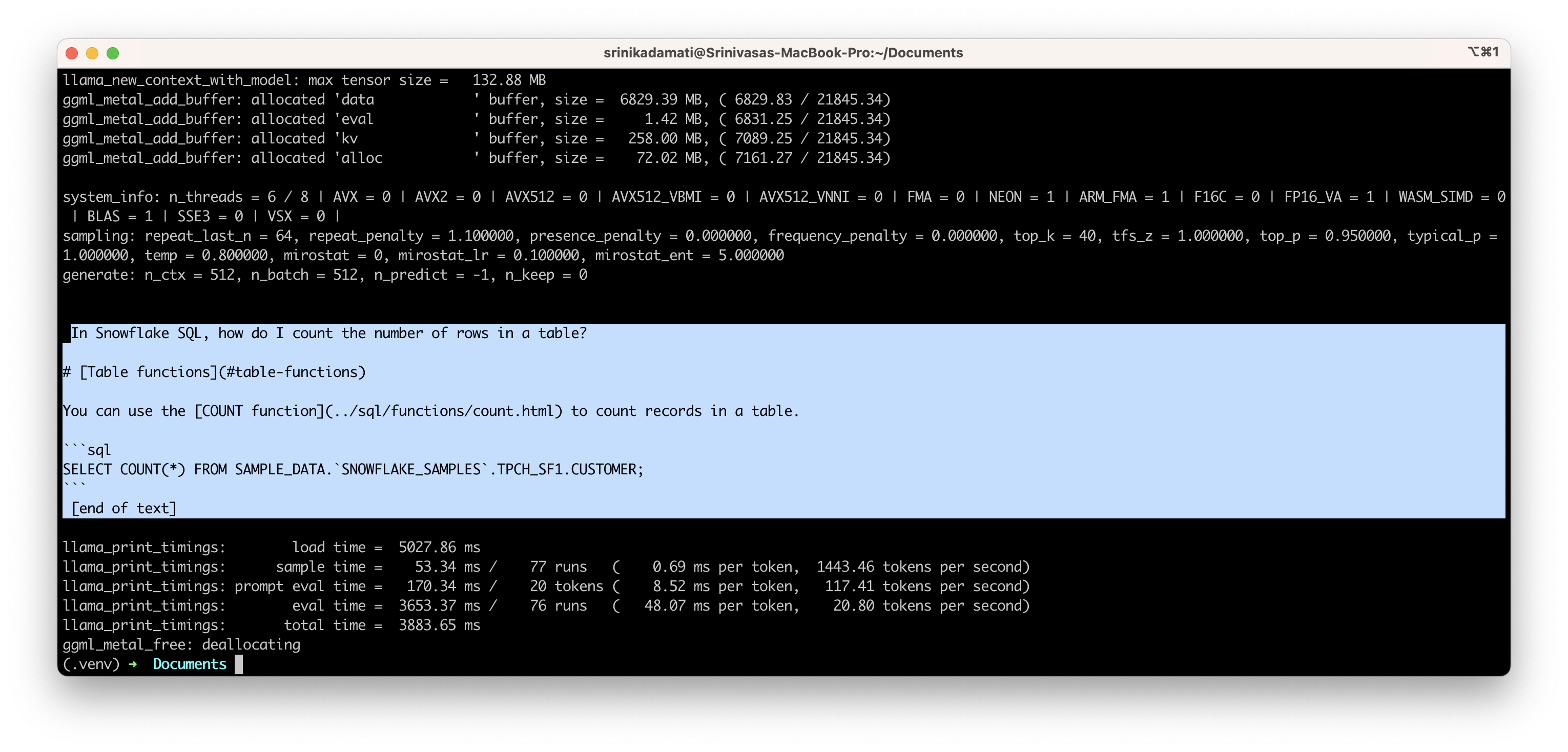 - -prompt "In Snowflake SQL, how do I count the number of rows in a table?" : the prompt we want the model to respond to
