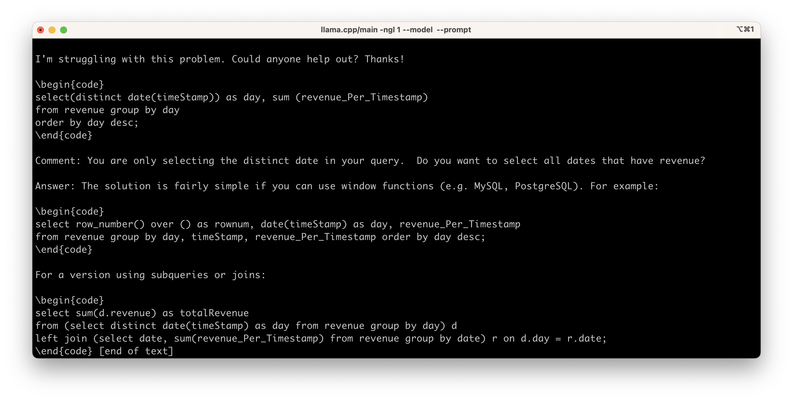 From this response, we can actually see some leakage from the underlying dataset (likely StackOverflow). Let's submit the prompt to the 8 bit version now: