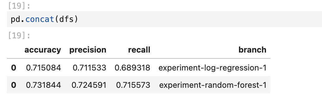 In the following code block, we append values from metrics.csv that reside in the 2 model branches we created earlier.