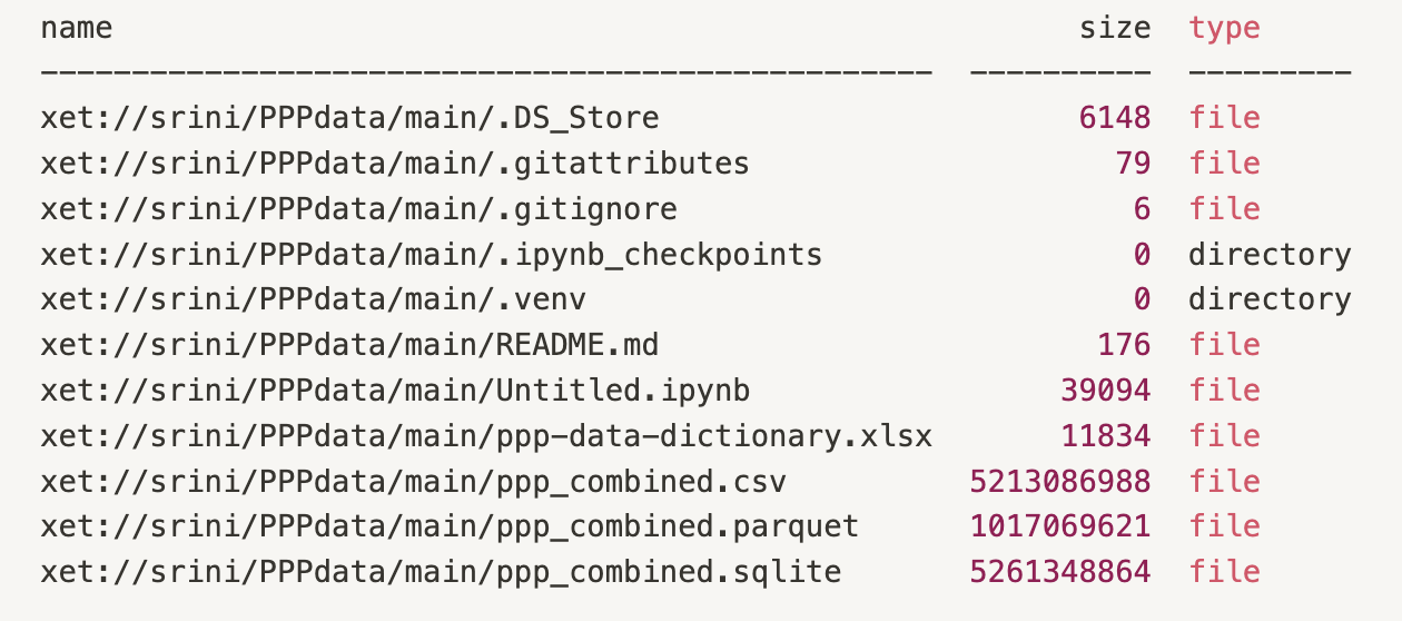 We can compare that to the current state of the repo by running xet ls xet://srini/PPPdata/main: