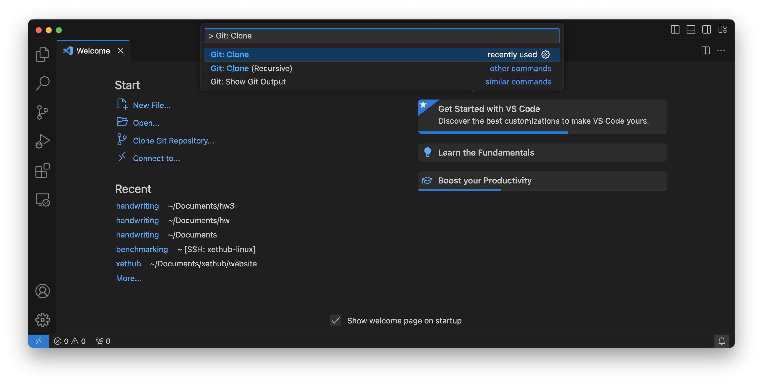 Open VS Code and fire up the command palette using Cmd + Shift + P (or Ctrl + Shift + P for Windows). Then, type "Git: Clone" and press Enter.