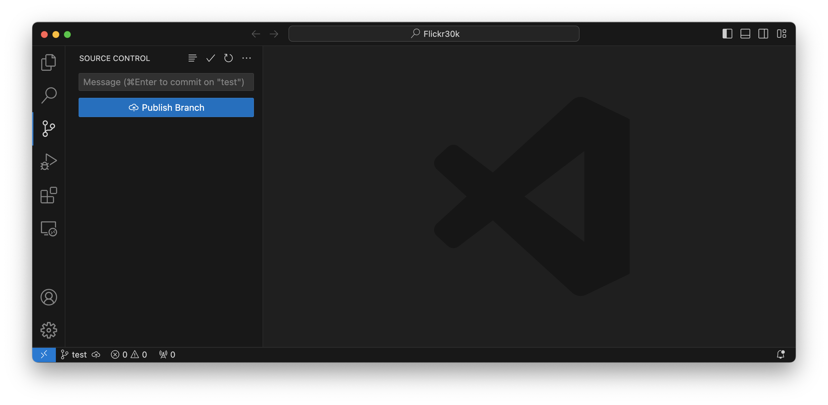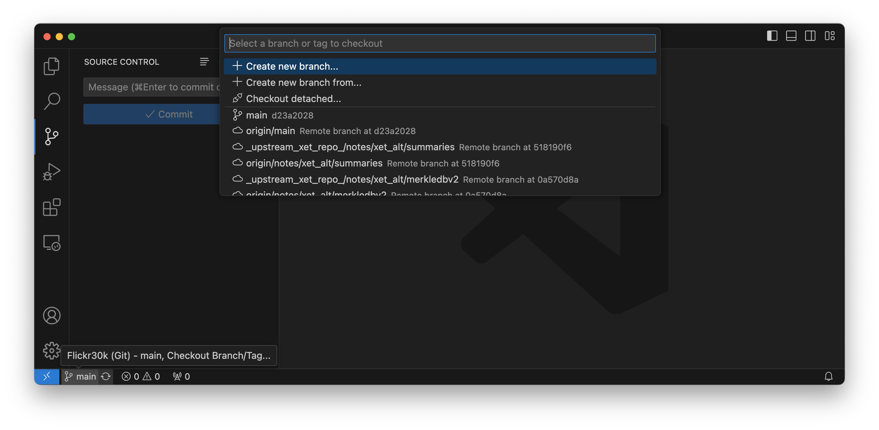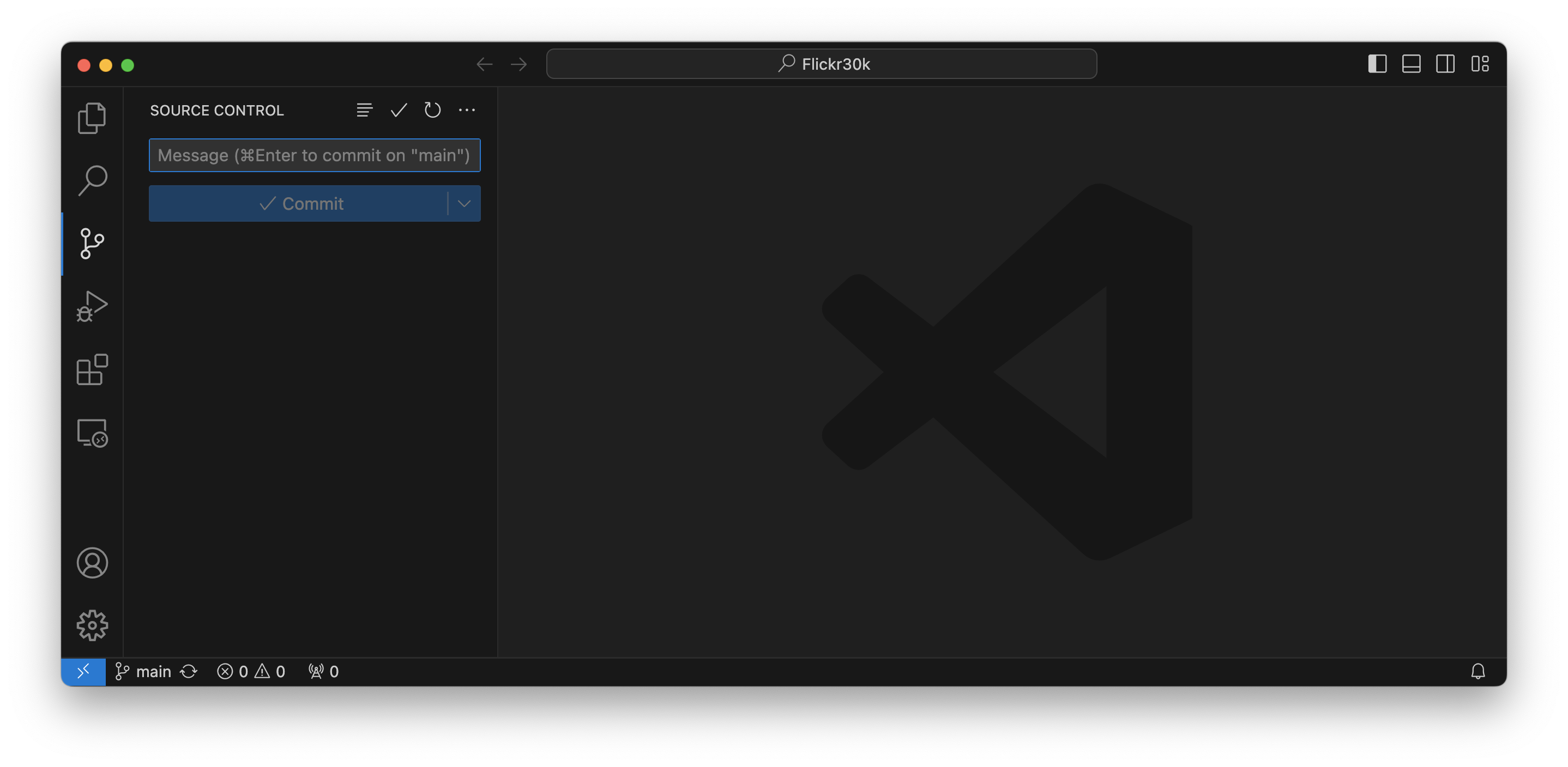 Open the Source Control tab to find an overview of changed files, current branches, and remotes. By default, this will be empty since you're on the main branch with no staged changes.