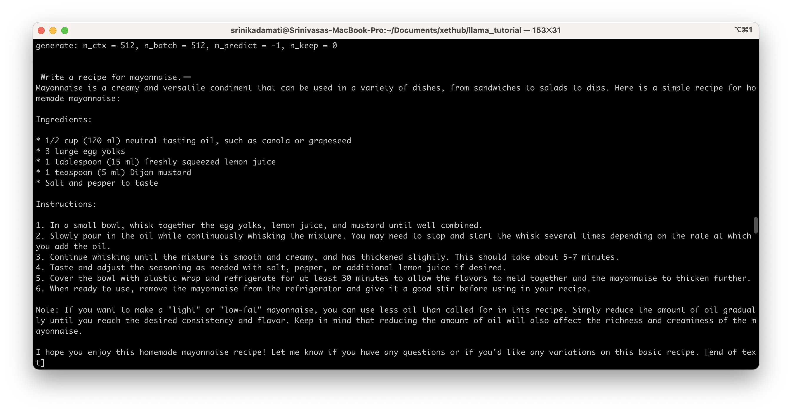 - --prompt "Write a recipe for mayonnaise." : the prompt we want the model to respond to