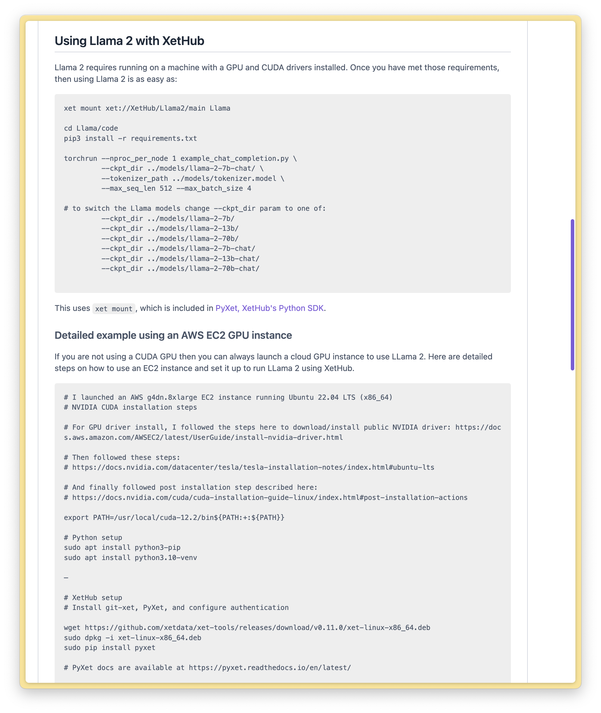If you have access to an NVIDIA GPU and want to experiment with running un-quantized models, check out the following section in our Llama 2 repo for the instructions. You can take advantage of the same capabilities of xet and XetHub to mount and stream different models.