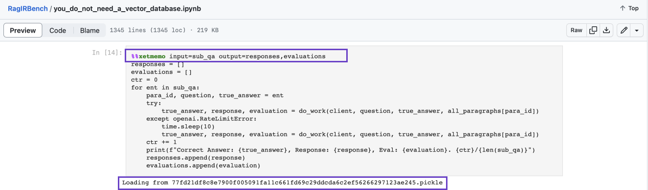 You can find lots of examples in the benchmarking notebook I used for my You Don’t Need a Vector Database post. By default, the cache is written to a local xmemo/ folder — cached pickle files are loaded back on re-runs as shown in the screenshot below.
